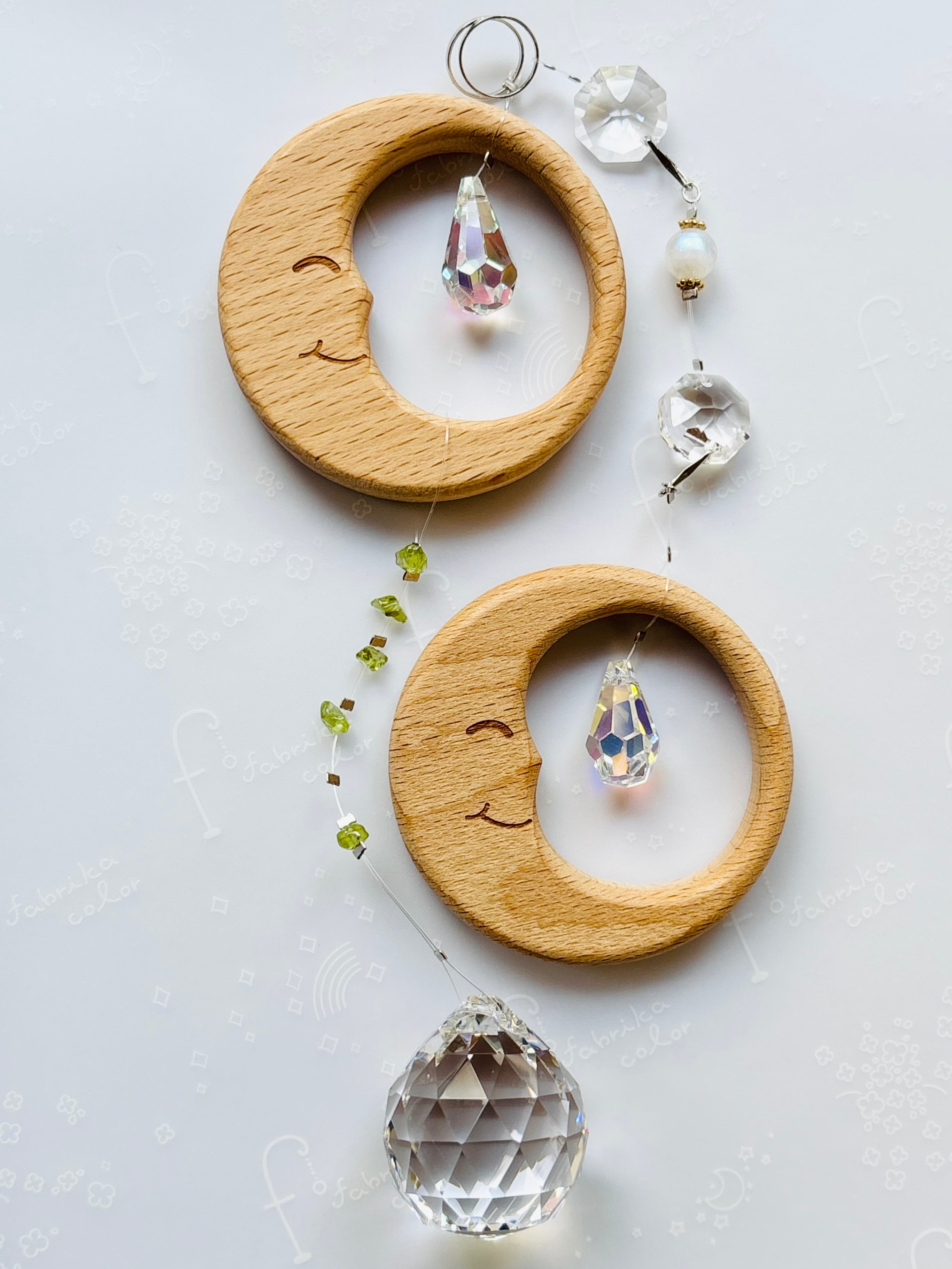 まるくてすべすべの木製パーツ(ブナ材)でサンキャッチャーを作りました。 優しく微笑むお月様。 お顔の印刷は片面のみ 裏面は無地です。 シンプルに仕上げました。 可愛いシルエットもお楽しみください。 ♢サイズ 全長約30cm×幅6cm×厚さ1cm ・お月様 直径6cm ・クリスタルガラス エジプト製オーロラ ボール型 直径3cm エジプト製ドロップ型 縦約2cm×幅約1.2cm×厚さ約1.2cm そのままプレゼントとしてお渡しいただける簡易ラッピング(無料)でお届けいたします。 ご質問などがございましたらご購入前に「メッセージ」または「ショップへのお問合せ」よりお気軽にご連絡ください。