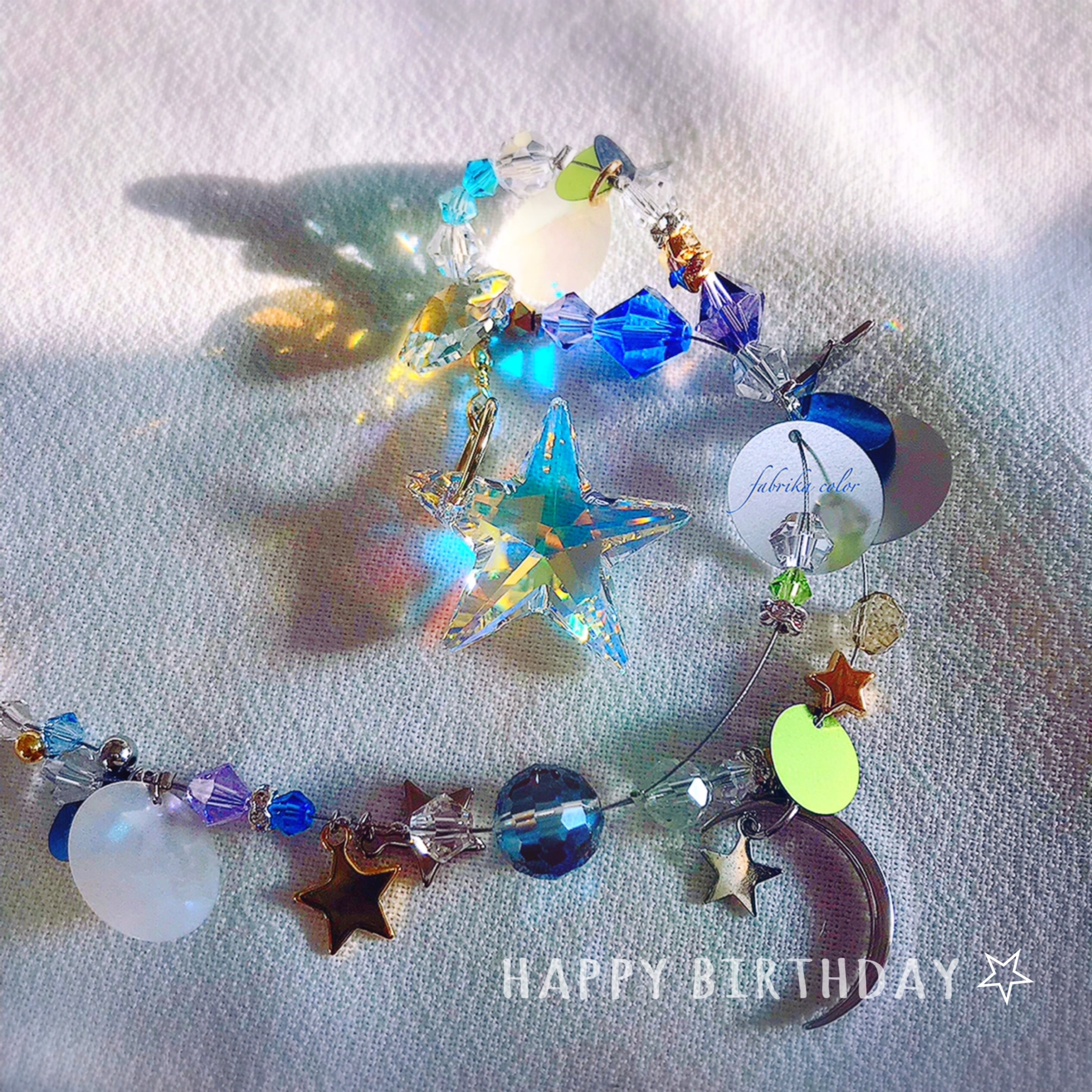 お誕生月の天然石を使用したサンキャッチャーです。 キラキラと光る美しいクリスタルガラスはお部屋のアクセントやプレゼントにもぴったりです。 お誕生石の色や意味を知ることで、新しい出会いや幸福が訪れるかもしれません。また、自分自身のクリスタルを持つことで、心のヒーリングにもつながります。 12月の誕生石はターコイズ(トルコ石)。 ターコイズは邪悪なエネルギーを跳ね除ける守護の石、旅のお守りとして知られ、心の解放を促し、目標に向かって前進する勇気や自由でクリエイティブな発想を促す石とも言われています。 石言葉は 自由・守護・行動力・願望達成・友情・信念など。 クリスタルガラスからの虹色の光と合わせ、石からの穏やかで優しいエネルギーに幸福感を感じていだけますように。 ♢使用クリスタルガラス・アスフォークリスタル ♢サイズ 全長 約20cm ・天然石 ターコイズ6mm ツイスト水晶 1.1cm×0.8cm ・クリスタルガラス アスフォークリスタル 直径2cm ♢ご購入前にご確認ください。 本作品に使用されているターコイズは、強い日光が当たると変色や褪色に繋がることがございます。 本来サンキャッチャーには組み込まれにくい石のため、ターコイズの色やエネルギー、石言葉をお好みの方、日の当たらないお部屋に飾られたい方へのおすすめのサンキャッチャーとなります。 クリスタルガラスからの虹につきましてはLEDライトの光源下でお楽しみいただけます。 以上ご了承の上ご購入いただきますようお願い致します。 *天然石について* 天然石には様々な意味や云われがありますが、効果や効能を保証・確約するものではございません。 そのままギフトにお使いいただけるような無料簡易ラッピング(袋)でお届けします。 ご質問などがございましたらご購入前に「メッセージ」または「ショップへのお問合せ」よりお気軽にご連絡ください。