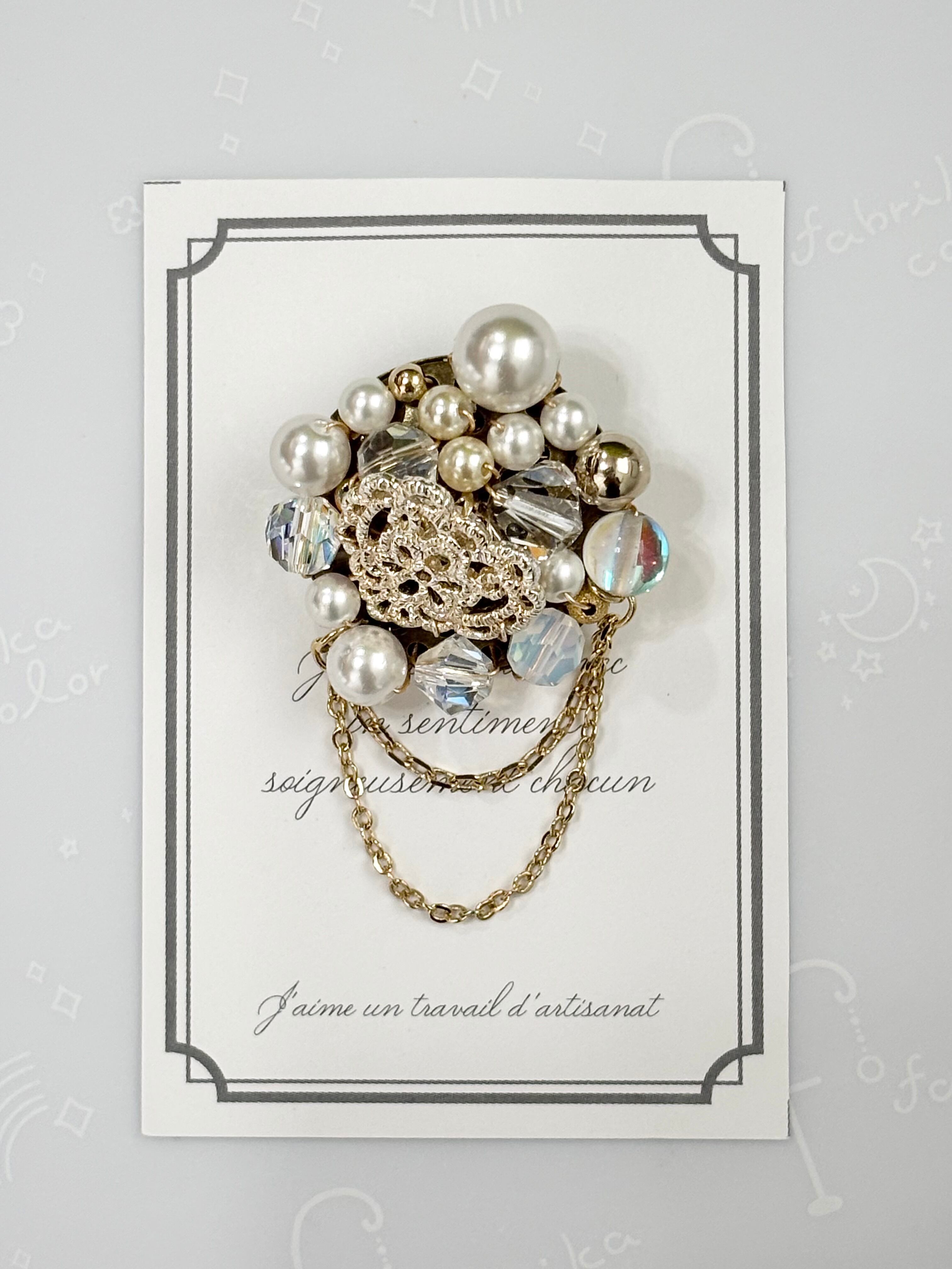 その日の気分に合わせて、胸元やバッグ、帽子、ストールなどに取り付けて楽しめるブローチ。 人工オパール(楕円)の優しいカラーとクリスタルガラスが揺れる、シャンデリアのような作品です。光が当たるとクリスタルガラスが煌めき 周囲を華やかに彩ります。おしゃれの楽しみを広げてくれるアイテムとしてぜひお迎えください。 ♢使用クリスタルガラス ・ラウンド型ビーズ…プレシオサクリスタル ・ソロバン型ビーズ…スワロフスキークリスタル ♢人工石 ・人工オパール(石英と樹脂の組み合わせビーズ) ♢オパールの石言葉 希望 友情 幸福 *天然石・人工石について* 様々な意味や云われがありますが、効果や効能を保証・確約するものではございません。癒やしや元気、幸せをサポートするアイテムとしてお楽しみください。 ♢サイズ ピン長さ 6.3cm×幅1.5cm 飾り部分 縦約3.5cm×幅5cm×厚さ0.9cm ♢カラー クリア ホワイト シルバー(金具) そのままギフトにお使いいただけるような無料簡易ラッピングでお届けします。 ご質問などがございましたらご購入前に「メッセージ」または「ショップへのお問合せ」よりお気軽にご連絡ください。