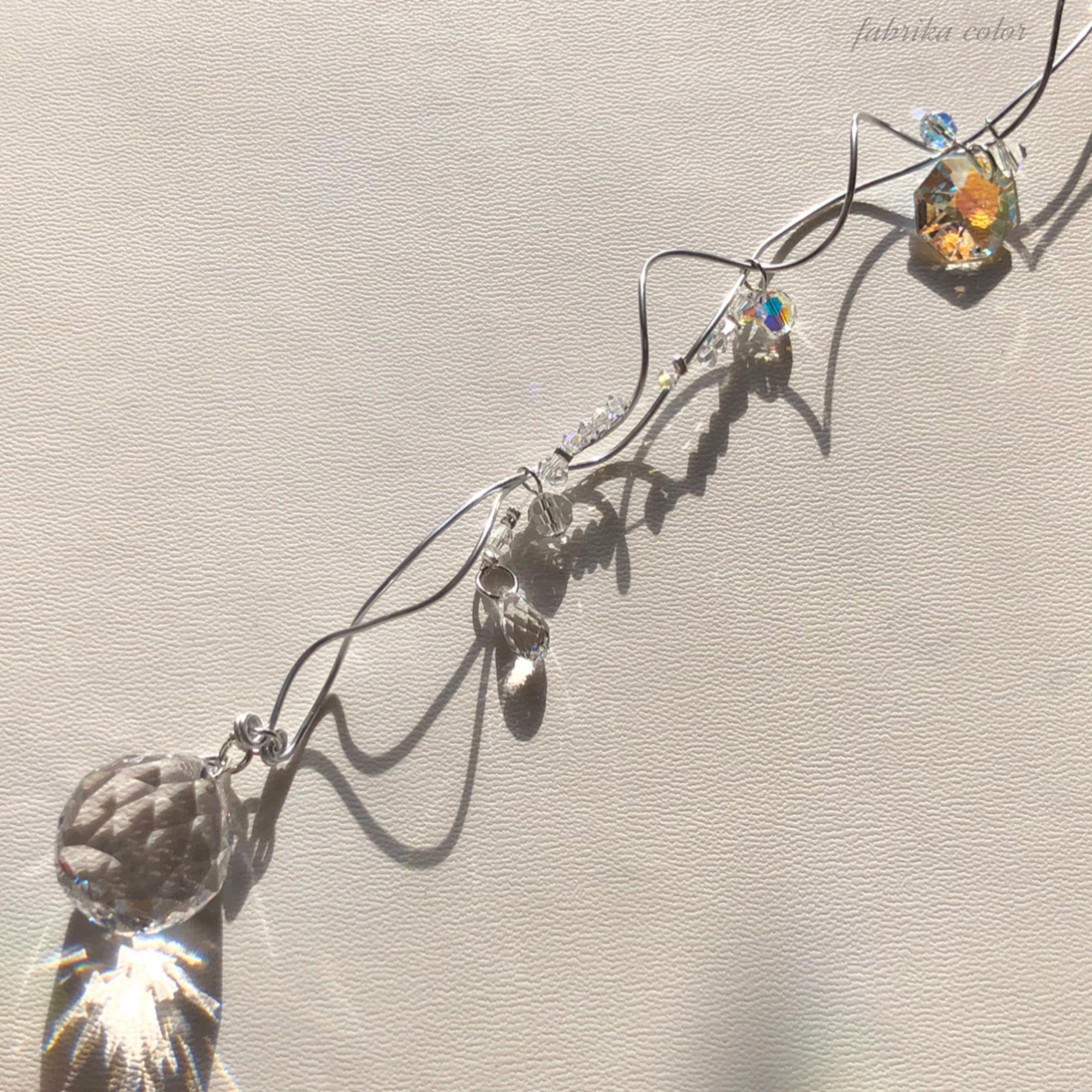 ワイヤー装飾をベースにチェーンやクリスタルガラスをあしらったサンキャッチャーです。 バラの蕾のついたポールの下にシャンデリアを配置しました。 もともとシャンデリアには「輝く」「白く光る」の意味を持つラテン語「Candere」、また、フランスでロウソク立てを意味するシャンデル(chandelle)が語源であるとする説があるそうです。 本作品は灯りはつきませんが、クリスタルガラスからの美しい輝きと虹はもちろんのこと 優しい曲線を描く艶消しワイヤーのパウダー状の煌めきや小さく揺れるビーズの可憐さなどがお部屋を一層素敵な空間に仕上げるお手伝いをいたします。 シャンデリアサンキャッチャーは、ご自宅はもちろん、オフィスや店舗のディスプレイ、ギフトとして大切な人への贈り物にも最適です。 全ての作品がハンドメイドの一点ものです。シャンデリアサンキャッチャーの輝きに包まれながら、特別なひとときをお過ごしください。 ♢ 使用クリスタルガラス ・ソロバン型クリスタルガラスビーズ0.8cm…プレシオサクリスタル ・ペンデローク型クリスタルガラスビーズ3.8cm…アスフォークリスタル ♢サイズ 全長約19.5cm×幅6cm×厚み0.5cm ※繊細な商品です。強い衝撃を与えますと形が崩れる場合がございます。お取り扱いにはご注意ください。 そのままギフトにお使いいただけるような無料簡易ラッピングでお届けします。 ご質問などがございましたらご購入前に「DM」または「ショップへのお問合せ」「メッセンジャー」等よりお気軽にご連絡ください。