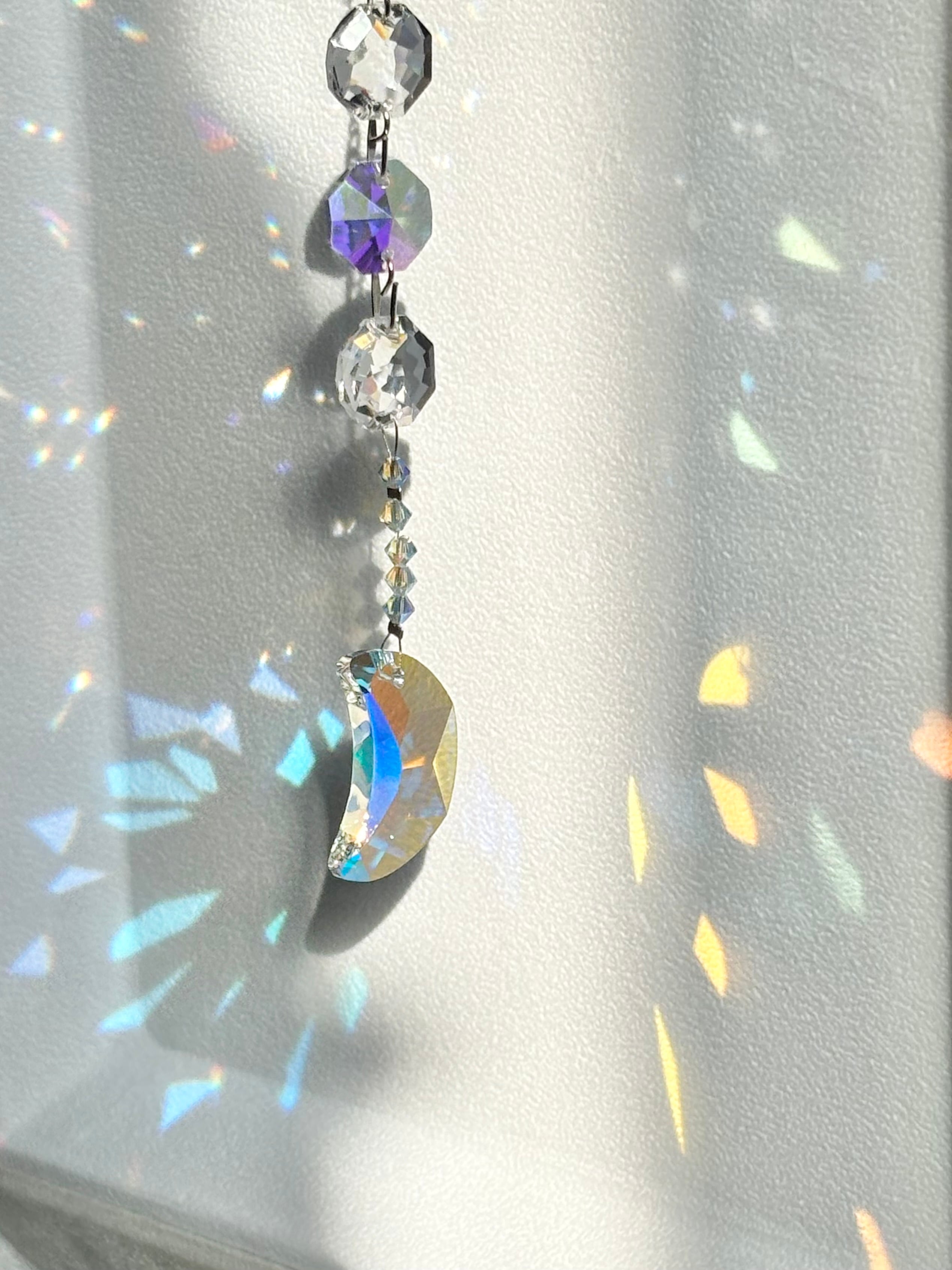 美しい三日月型のサンキャッチャーで、お部屋に輝きを届けます✨ オーロラ加工が施されたクリスタルガラスからは、小さな光と虹の粒がキラキラと反射し、心地よい空間を演出します。インテリアとしてはもちろん、特別な日のギフトにも最適です。 【クリスタルガラスについて】 高品質なオーストリア製クリスタルガラスを使用しております。この三日月のデザインは、光の当たり方によってさまざまな表情を見せるため、おしゃれなお部屋作りにぴったりです。 ♢サイズ 全長約26cm 三日月型本体…縦3cm 横2cm 厚さ0.9cm ♢メインクリスタルガラス ・三日月型クリスタルガラス…Moon Pendant(オーストリア製) そのままプレゼントとしてお渡しいただける簡易ラッピング(無料)でお届けいたします。 ご質問などがございましたら、購入前に「メッセージ」または「ショップへのお問合せ」でお気軽にご連絡ください。