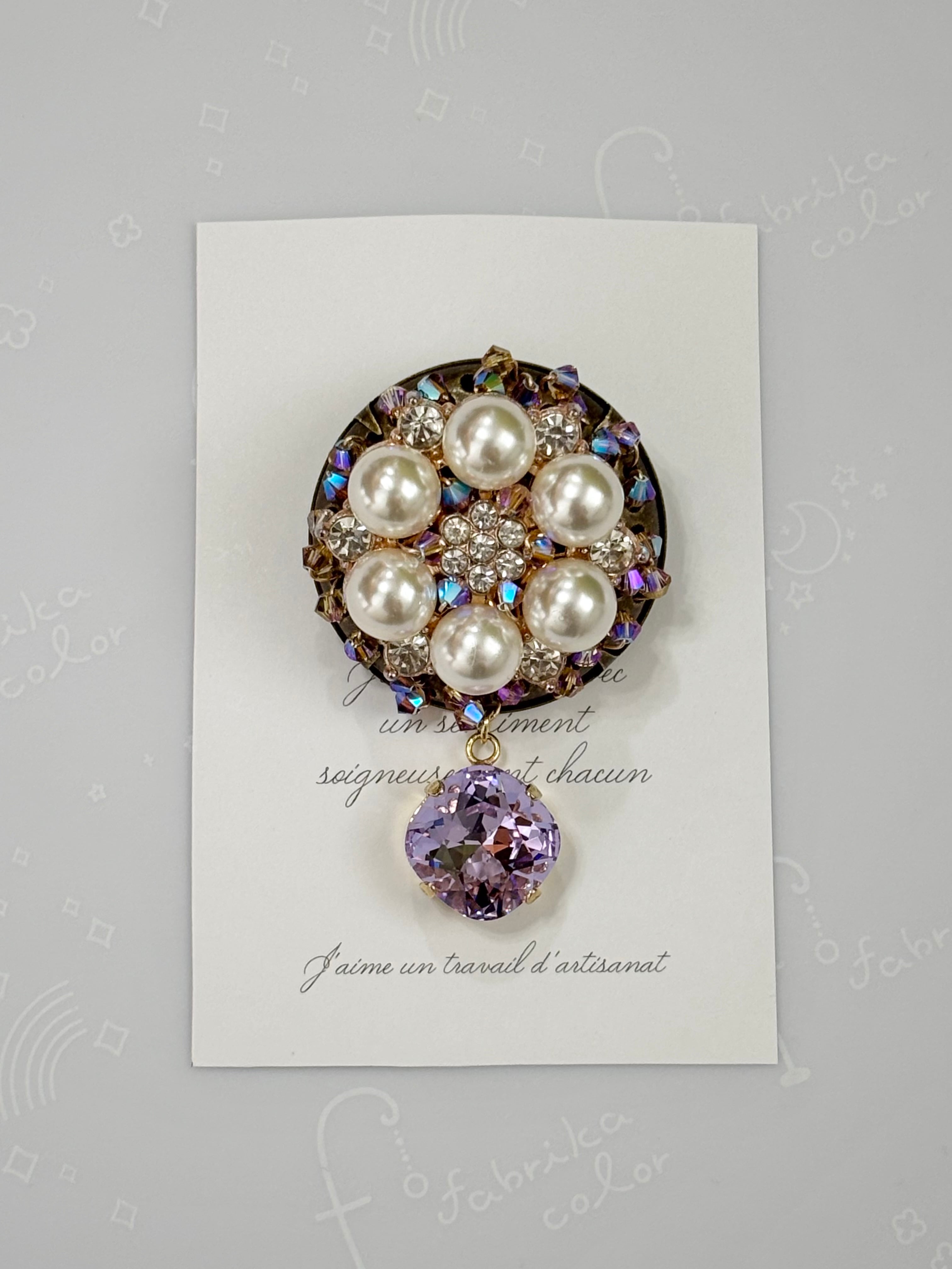 パール調ビーズとクリスタルガラス& ヘリオトロープ色のビーズの組み合わせが光や角度によりきらめきや小さな虹を映します。特別な日にも活躍するアクセサリーです。 メンズ用としてもおすすめ。カーディガン、ジャケット、スーツ、コートなどに合わせてお楽しみいただけます。 【多彩な使い方】 ピンにゴムを通すことで、髪飾りとしての使用も可能。バッグや帽子などに添えてもおしゃれです。 ♢ サイズ 全長約5cm ビーズ部分約5cm×3cm×2cm 簡易ラッピングでお届けします。 *こちらの作品は送料無料でお届けいたします ご質問などがございましたら、購入前に「メッセージ」または「ショップへのお問合せ」でお気軽にご連絡ください。