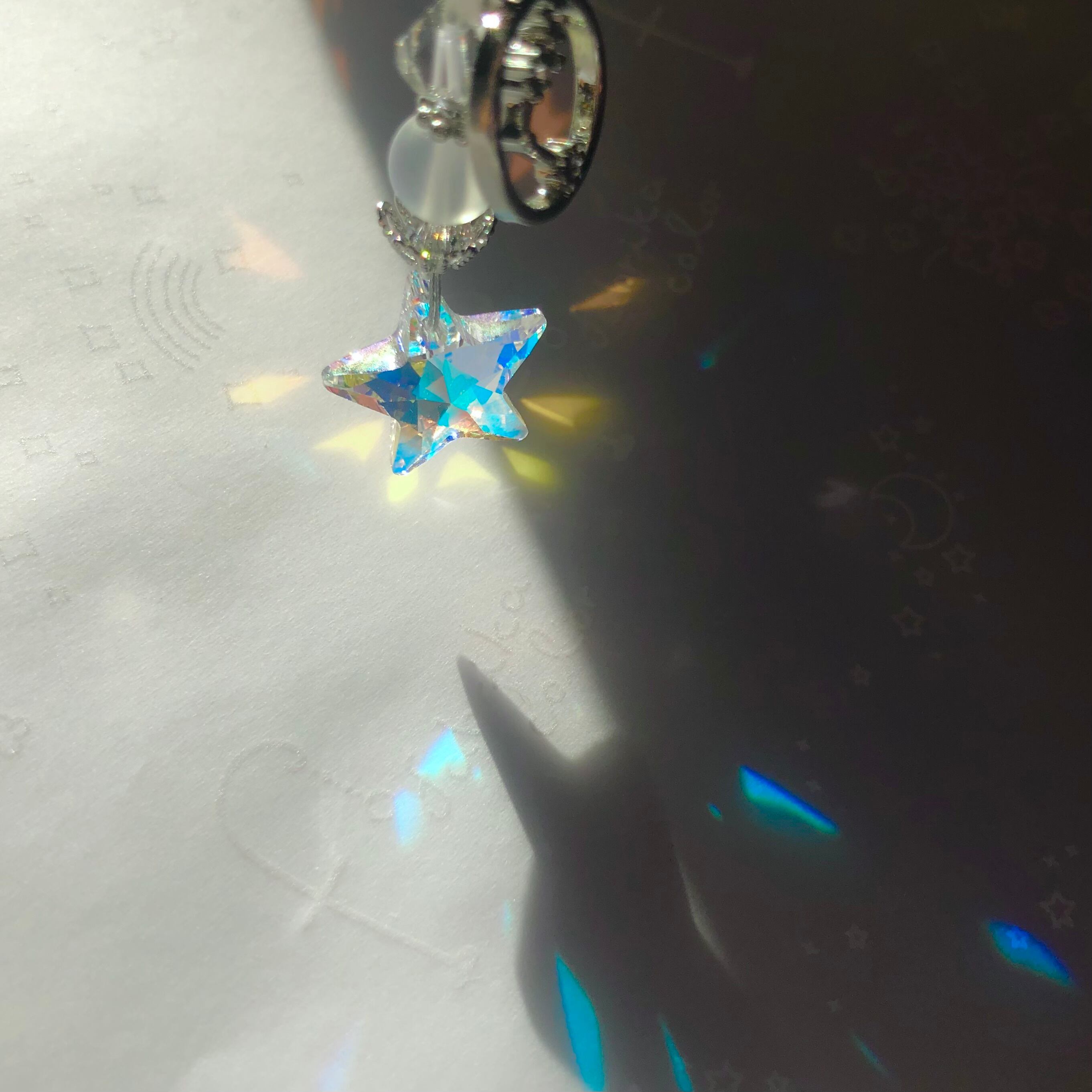 画像では星のオーロラ加工のある面と加工のない面を掲載しています。光り方、見え方は違いますが全て同じクリスタルガラスを使用しています。