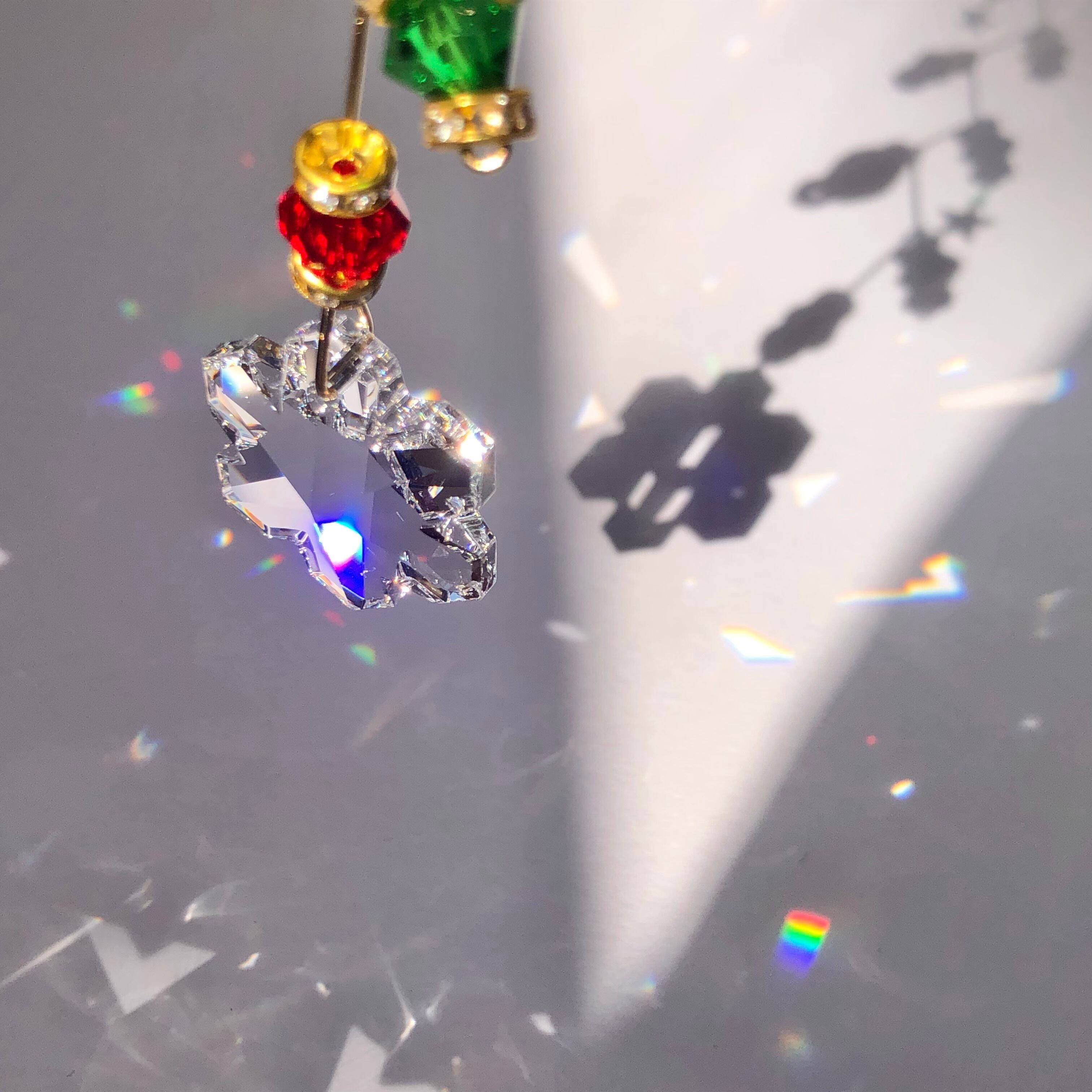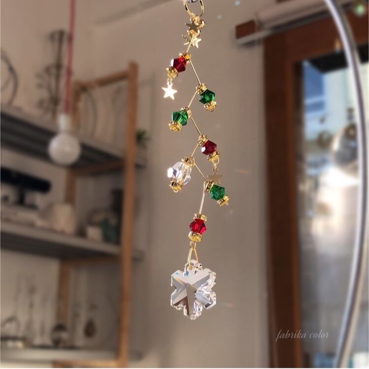 赤と緑のオーナメントを飾った枝のようなラインを雪の形のクリスタルガラスに繋げたサンキャッチャーです。